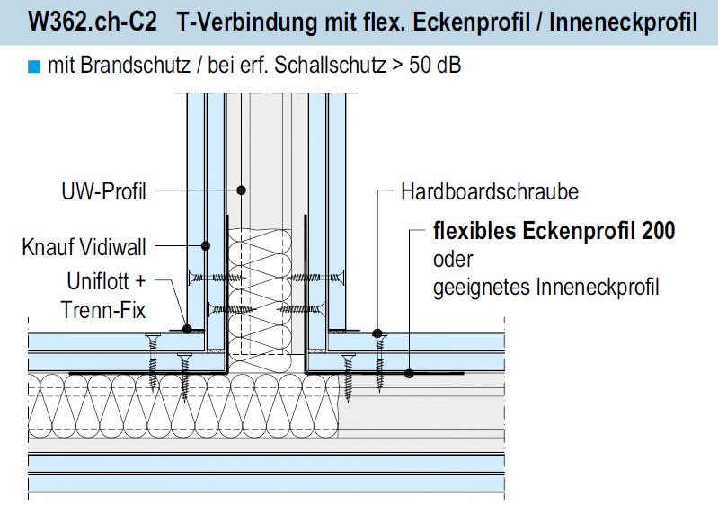 232.310 Gipsfaserplatten Dicke mm 12,5. Ständerwand Dicke mm 150,0. Bewertetes Schalldämmmass Rw min. dB 57. Feuerwiderstandsklasse EI 90. |