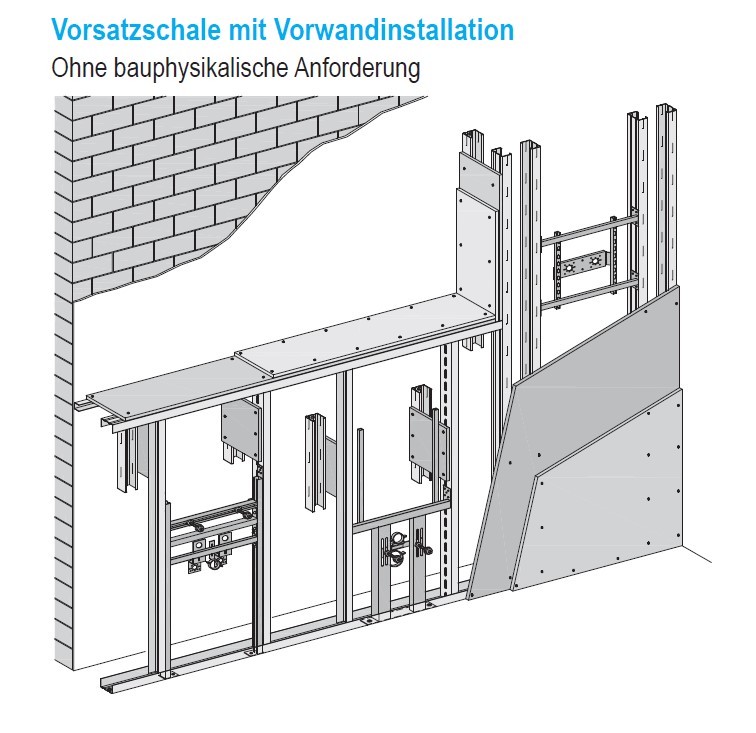 341.000 Frei stehende Vorsatzschalen erstellen. Einfaches Ständerwerk aus Metall. Beplankung 1 Lage zementgebundene Leichtbeton-Bauplatten. |