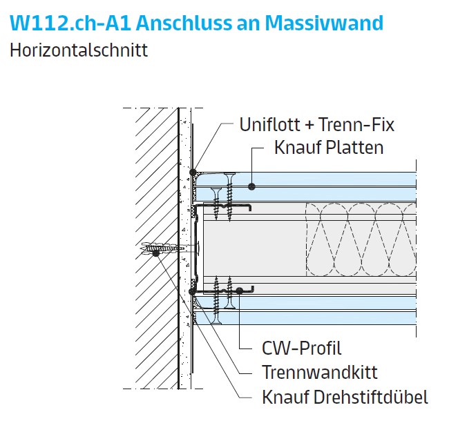211.210 Gipsplatten Typ A, Dicke mm 12,5. Ständerwand Dicke mm 100,0. Bewertetes Schalldämmmass Rw min. dB 45. Feuerwiderstandsklasse EI 30. |
