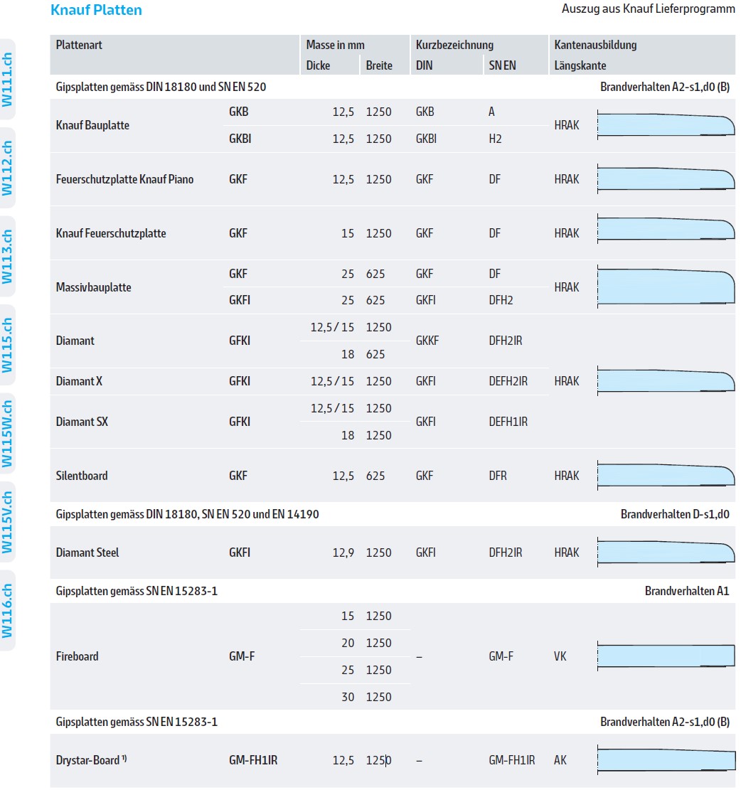 216.310 Hartgipsplatten Typ DFIR, Dicke mm 12,5. Ständerwand Dicke mm 255,0. Bewertetes Schalldämmmass Rw min. dB 72. Feuerwiderstandsklasse EI 90. |